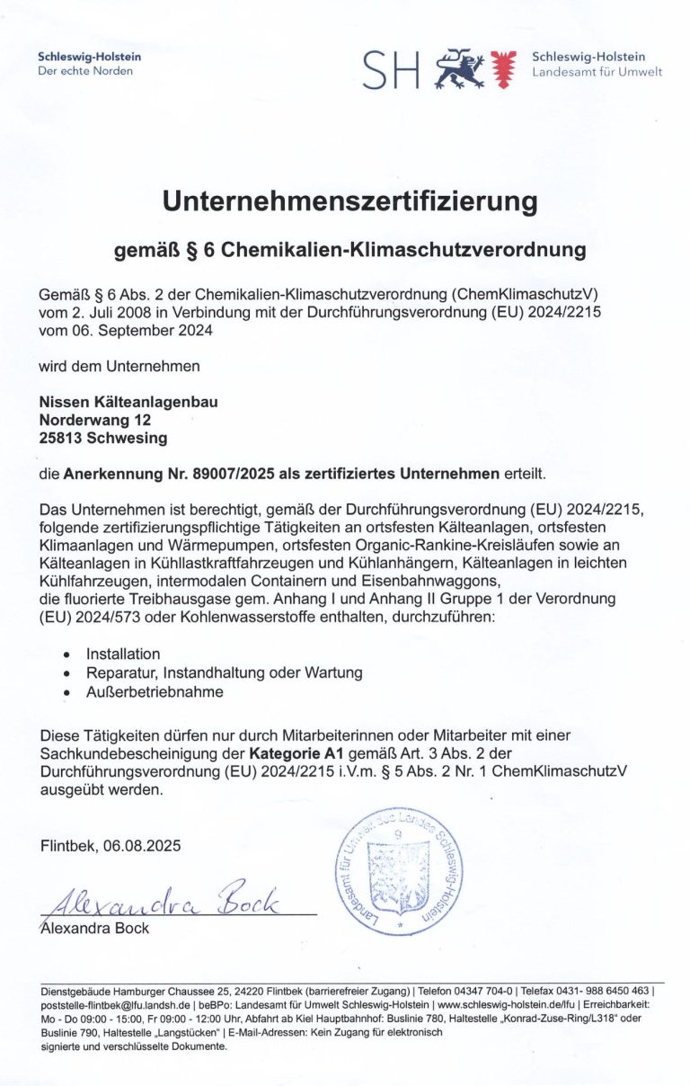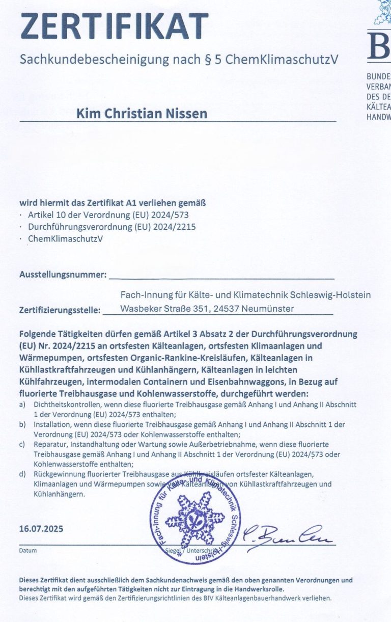 Sowohl als Unternehmen als auch persönlich bin ich gemäß den geltenden gesetzlichen Vorgaben zertifiziert und berechtigt, Installation, Wartung, Reparatur, Dichtheitskontrollen und Rückgewinnung von Kältemitteln durchzuführen.